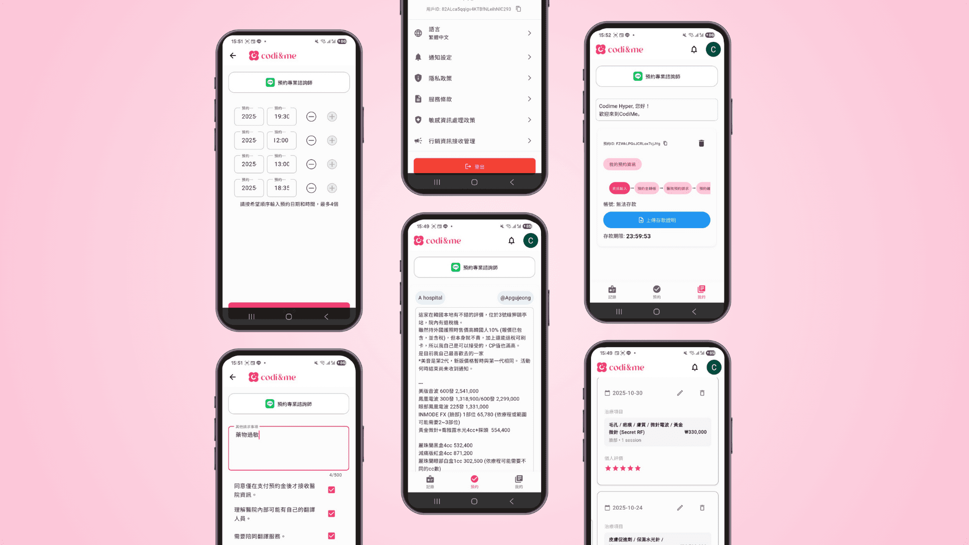在專屬 APP 上記錄您的療程細節與術後心得,並仔細規劃下次的管理週期。回到台灣後,codi&me 也能持續為您進行照護。